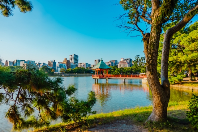 地下鉄で数分の大濠公園は、大きな池を囲む美しい水景公園で、ジョギングや散策を楽しめる市民の憩いの場として親しまれています。