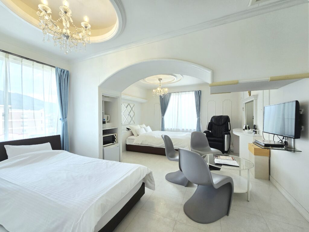 The room is bright and clean based on white, and the chandelier lamp illuminates the room gently at night. Spend your<br /> anniversary or special day with your loved ones in a mood-filled room.