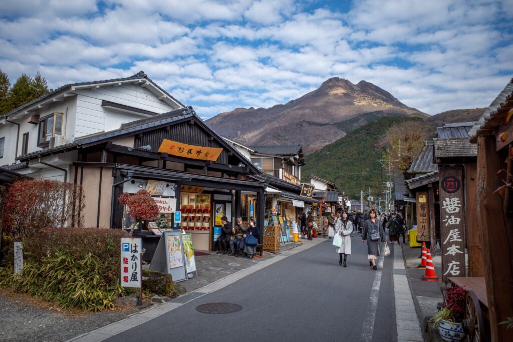 由布岳の麓に位置する湯の坪街道は、風情ある町並みに土産物店や飲食店が並ぶ由布院観光のメインストリートです。美しい景色を眺めながら、大分のご当地グルメの食べ歩きやショッピングを存分に楽しめます。