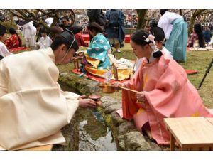 この宴は、十二単などの平安時代の装束を身にまとった参宴者たちが